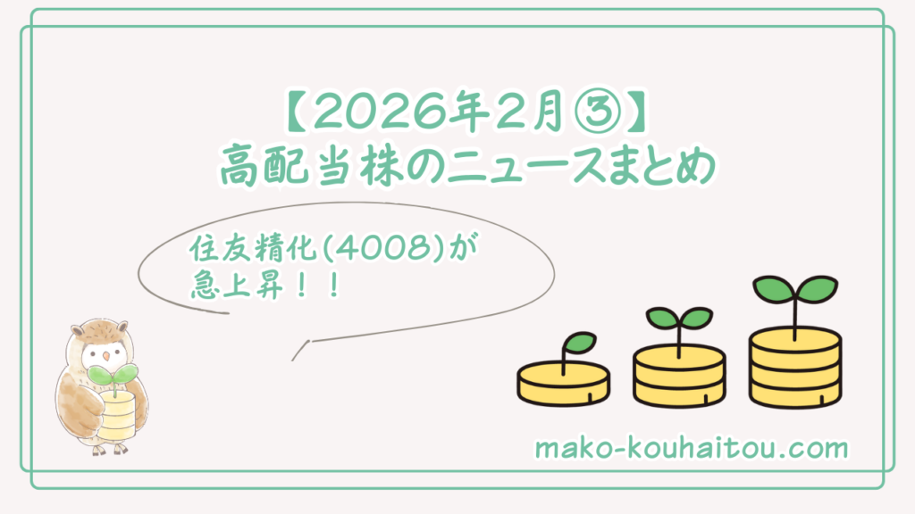 本記事では2026年2月9日から13日までの私が気になった高配当銘柄に関するトピックスをまとめています。 気になる投資関連のニュースをまとめてみました。 高配当株投資をする上で、参考にしてみてくださいね。 【2026年2月9日〜13日】高配当株トピックス ... -