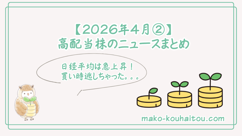 2026年4月6日〜11日の気になる高配当株のニュースをまとめました。 日経平均株価が一気に回復した1週間でした。 高配当株投資をする上で、参考にしてみてくださいね。 今週の相場|日経平均が51,000円台から57,000円近くまで急回復 中東情勢の不安が強まり... -