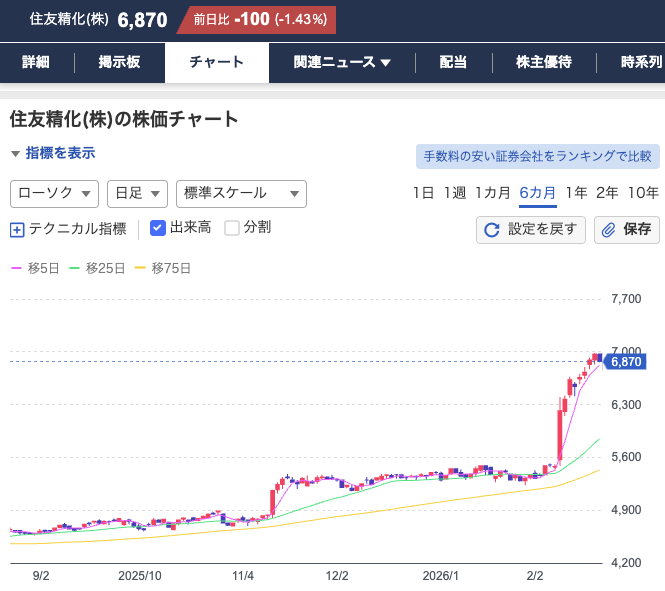 住友精化(4008)が2月以降急上昇
