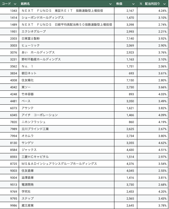 コード銘柄名株価(円)配当利回り