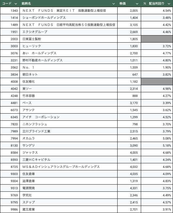 ※ 2003(日東富士製粉)・4008(住友精化)は株式分割の影響により、利回りは参考値として「—」表示にしています。